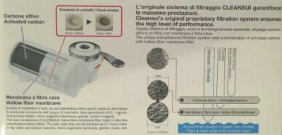 Componenti della cartuccia filtro: carbone attivo antibatterico combinato con un’innovativa membrana a Fibra cava in grado di trattenere eventuali batteri e impurità di dimensione fino a 0,1 micron (1 micron = 1 millesimo di mm).
